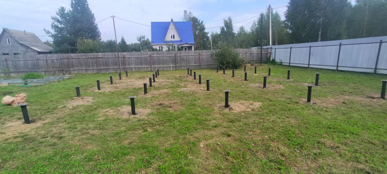 Компания "Сваекрутов" успешно завершила проект по строительству фундамента на винтовых сваях для будущего дома размером 10х8 метров. Проект выполнялся на участке заказчика в городе Талдом, Московской области. Главной задачей было создание надежного и прочного основания, на котором в дальнейшем будет возводиться дом. Для монтажа использовались винтовые сваи диаметром 108 мм и длиной 2,5 метра. На каждую сваю был установлен оголовок, обеспечивающий надежное крепление для последующей обвязки фундамента.